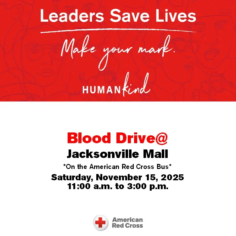 Jacksonville Mall will be hosting an American Red Cross Blood Drive. To schedule an appointment, visit Red Cross and search zip code 28546.